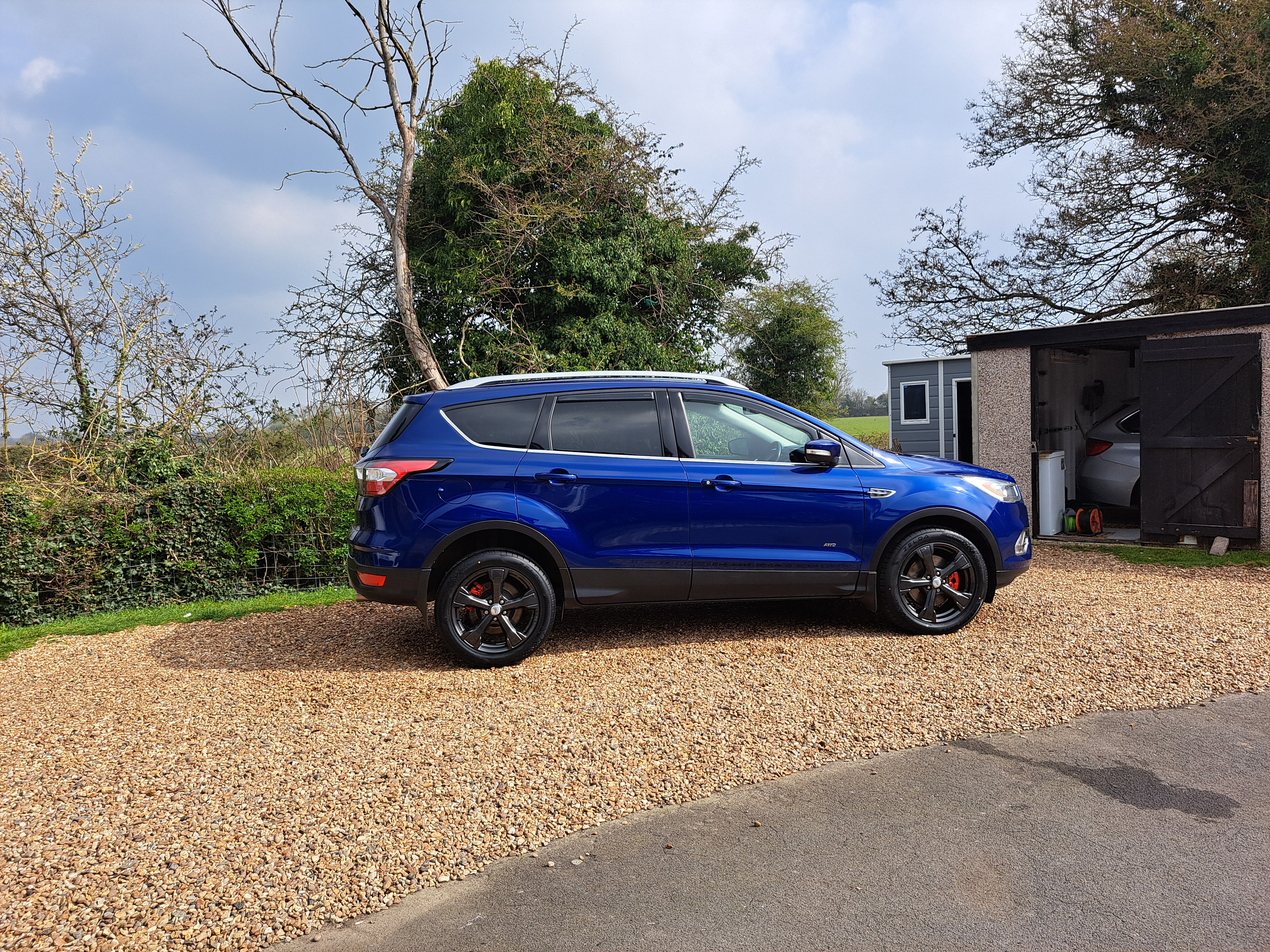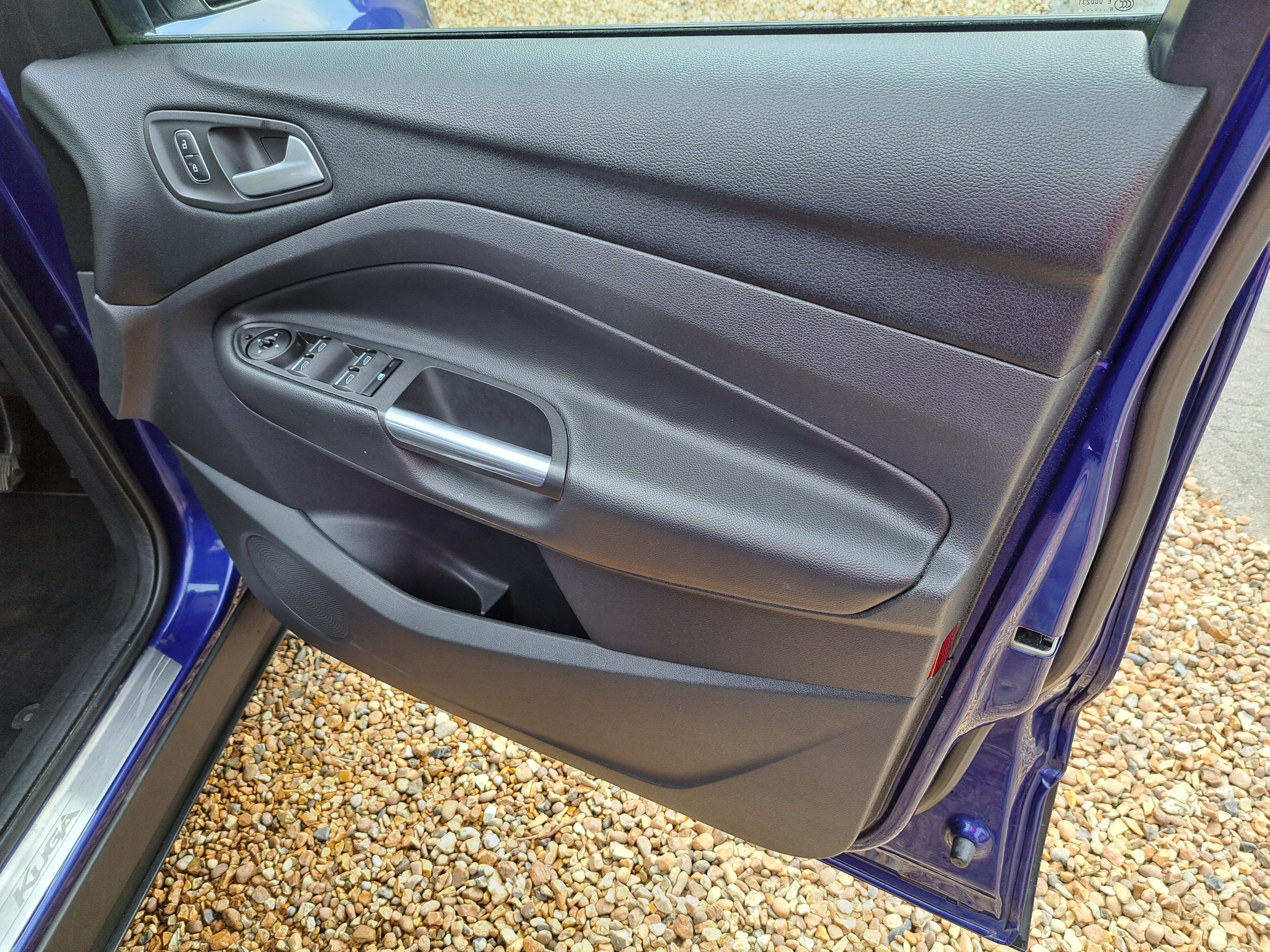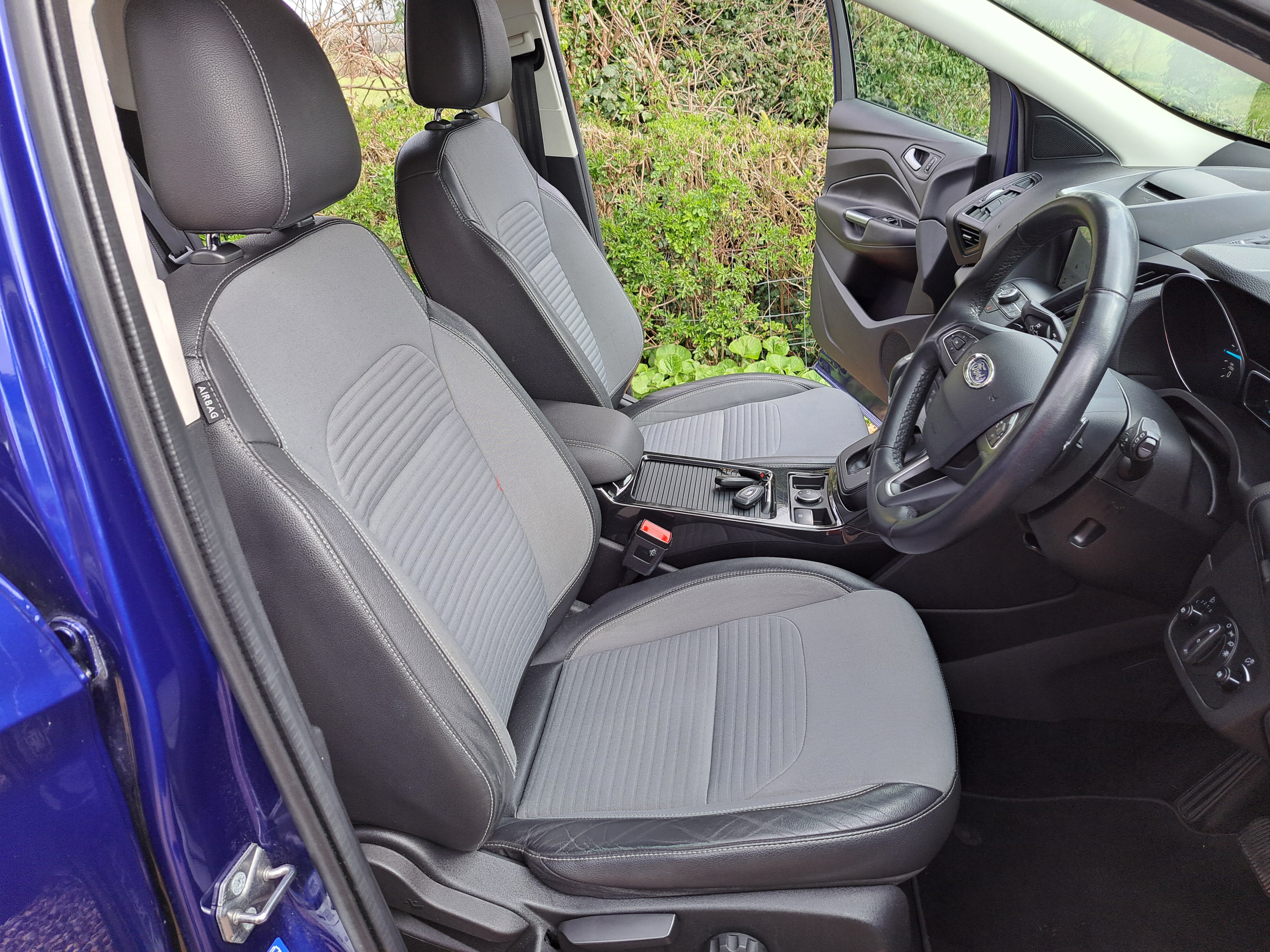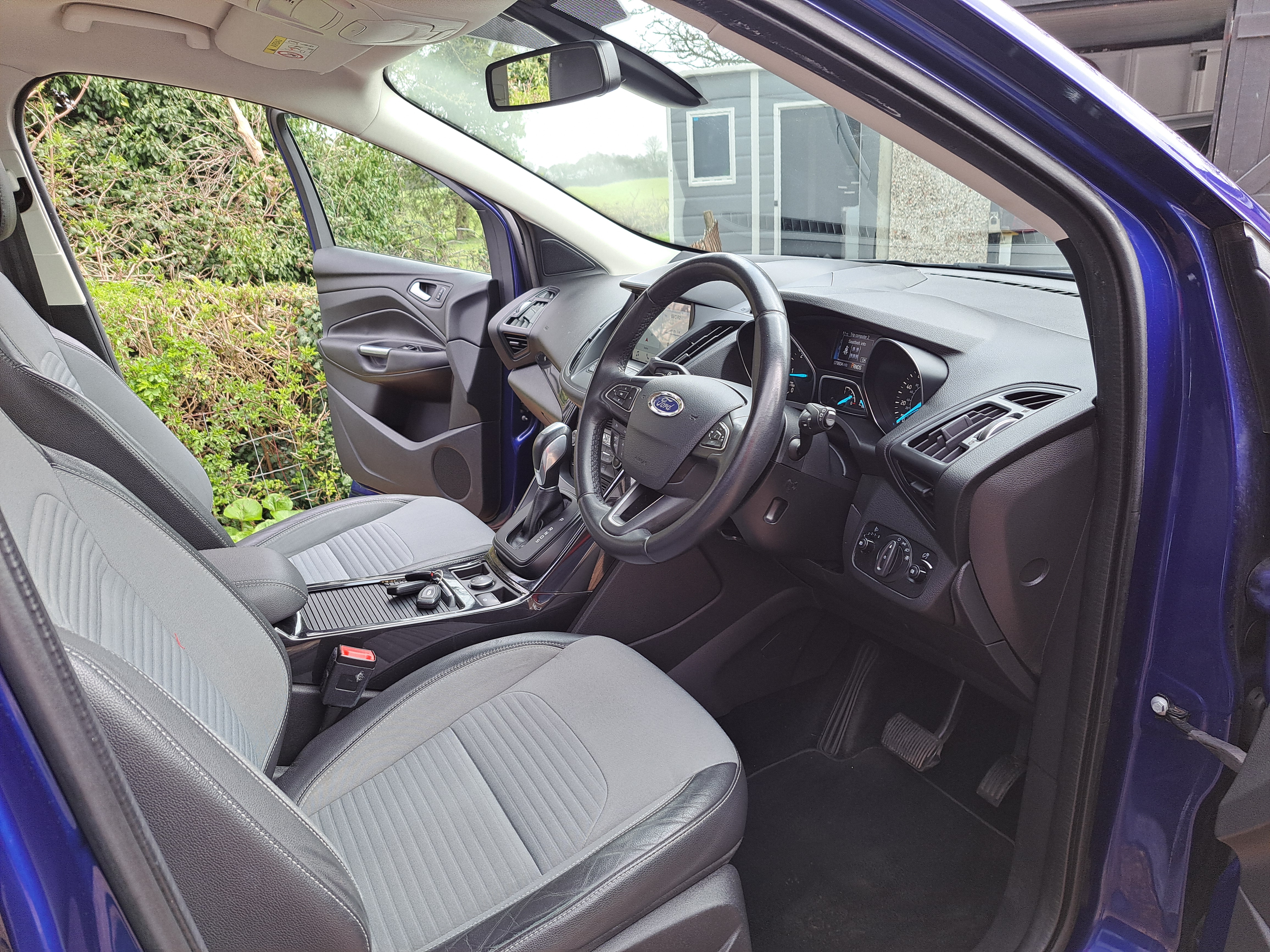This immaculate Kuga has covered 79,930 miles with FULL MAIN DEALER SERVICE HISTORY. Just serviced last week, including 4 new tyres. 2 non-smoking owners from new, the latter, since 2019. It is in just stunning condition, gleaming, unmarked Deep Impact Blue, paintwork, spotless interior, with front & rear cover carpets over untouched carpets, unmarked, 18″ Anthracite alloys with brand new tyres. It drives faultlessly, I have done over 100 miles in it, it is an absolute pleasure to drive. Being the Titanium 180, it comes with: KEYLESS ENTRY (2 working fobs + manual key) .. PUSH BUTTON START/STOP .. AUTO LIGHTS .. START/STOP with HILL ASSIST .. ELEC FRONT & REAR WINDOWS with REAR PRIVACY GLASS .. REAR PARKING CAMERA .. REAR PARKING SENSORS .. BI-FOLD, ELECTRIC, HEATED MIRRORS ..ELEC, AUTO RELEASE HANDBRAKE .. DUAL DIGITAL CLIMATE CONTROL .. HEATED SCREENS .. FRONT & REAR WIND DEFLECTORS .. 6 SPEED AUTO, POWERSHIFT with SPORT MODE & PADDLES .. MULTI FUNCTION SPORT LEATHER WHEEL .. CRUISE CONTROL .. D.A.B, SYNC, ENTERTAINMENT, INFO CENTRE with SAT-NAV, BLUETOOTH, VOICE CONTROL & ALL PORTS .. PART LEATHER .. MULTI AIRBAGS .. ISOFIX CHILD SEAT FIXING .. F&R FITTED COVER CARPETS etc. This really is a superb vehicle in every way. PART EXCHANGE WELCOME .. 6 MONTHS RENEWABLE WARRANTY, ROADSIDE ASSISTANCE INCLUDED.